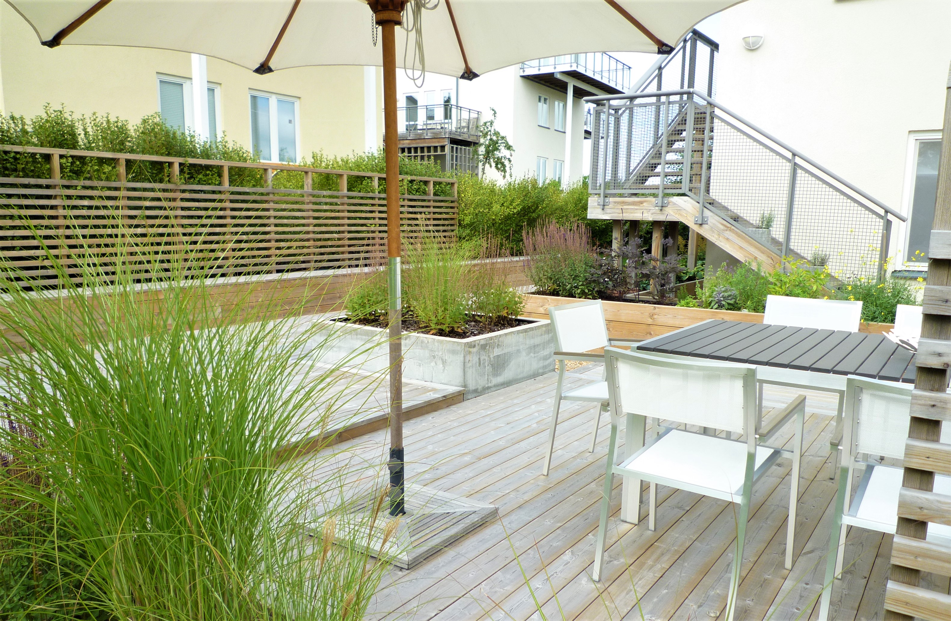 I samband med husets renovering och en ny utbyggnad ville kunden få en ny trädgårdsdesign för tomten. En ny altan, samt gånger och gräsmatta behövde passa in med trädgårdens olika nivå på ett syggt sätt.
