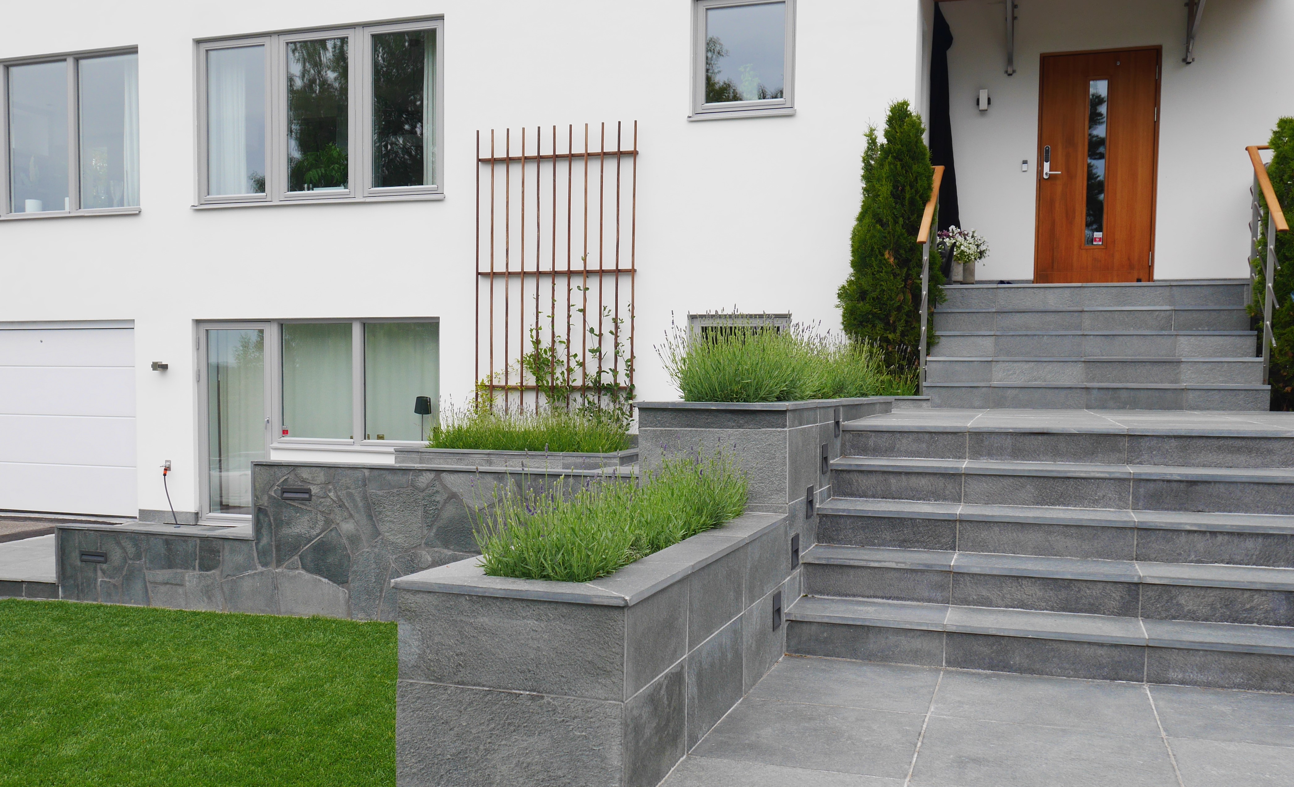 Ett helt nytt hus som behövde struktur för att huset kunde anpassa sig till omgivningarna på ett sätt som passade båda arkitekturen och området. Betong stödmurar mjukadas upp med perennplantering och en ny ligusterhäck. Till ingången valdes oregelbunden natursten för att bryter lite från de strikta linjerna.